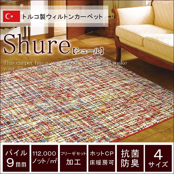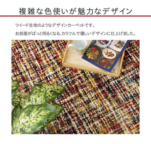 トルコ製のウィルトン織りカーペットです。本商品の『繊維の密度を表すノット数』は112,000ノットです。カラフルな幾何柄を落ち着きのある色合いでまとめました。本商品のパイル部分にはポリプロピレン素材を使用しております。ポリプロピレンはヘタリにくく、耐久性に優れ、繊維の中でも軽い素材です。また、汚れが付着しにくく、遊び毛や毛玉が非常に出にくいという特徴もあります。本商品にはフリーゼセット加工を施しております。フリーゼセット加工でパイルをツイストすることによりボリューム感を出し、ふかふかとした肌感触に仕上げました。ホットカーペットカバーや床暖房にも対応しております。安心して年間お使い頂けるカーペットです。