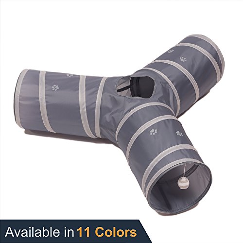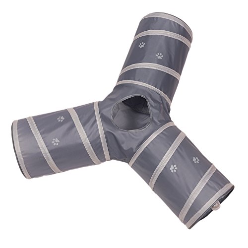Give your cat hours of entertainment and exercise with this fun, collapsible 3-way cat tunnel. Featuring a variety of "bells whistles," it's the purr-fect playground for high-energy felines! You adore your cat, but let's face it: you don't have a lot of time to play with him during the day. Luckily, with the Prosper Pet 3-Way Cat Tunnel, your kitty can entertain himself for hours! This unique playtoy is three spacious tunnels in one, giving your cat more room to roam, pounce, and hide than other single tunnels. Unique details like a peephole and swinging bell toy crank up the fun for your feline. One of the tubes is lined with crinkly/crackly material that your cat will find irresistible! This tunnel features a sleek black design with pink accents - no obnoxious loud prints. It's made of durable 190T polyester that resists snagging and tears, even from sharp kitty claws. The rugged steel frame helps maintain the tunnels shape over time, with covered ends to keep your cat safe from pokes. Best of all, our cat gym is completely WASHABLE! The Prosper Pet 3-Way Cat Tunnel collapses into a compact size, so it's easy to take the fun with you anywhere - whether you're dropping Fluffy off at the sitter's or traveling cross-country. A great Christmas or birthday gift for cats their owners! * 3 tunnels in one - more entertaining for your cat or kitten * Includes swinging bell toy * Features peep hole in middle * 1 tube lined with crackling paper * Durable, washable polyester * Polyester doesn't collect pet hair * Strong sprung-steel frame w/protective ends * Collapses for easy travel storage Click "Add to Cart" to buy now! 0 |