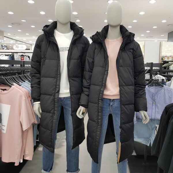 남여공용 구스 롱패딩이에요 퓨어클러스터가공 구스로 보온성 세탁후 복원력이 좋고 롱패딩으로 나왔으나 가벼워서 부담스럽지 않아요 또 옆사이드 밑단에 지퍼가 있어 활동시에 불편하지 않아요 무엇보다 깔끔한 디자인이라 어느 누가 입어도 부담스럽지 않아요