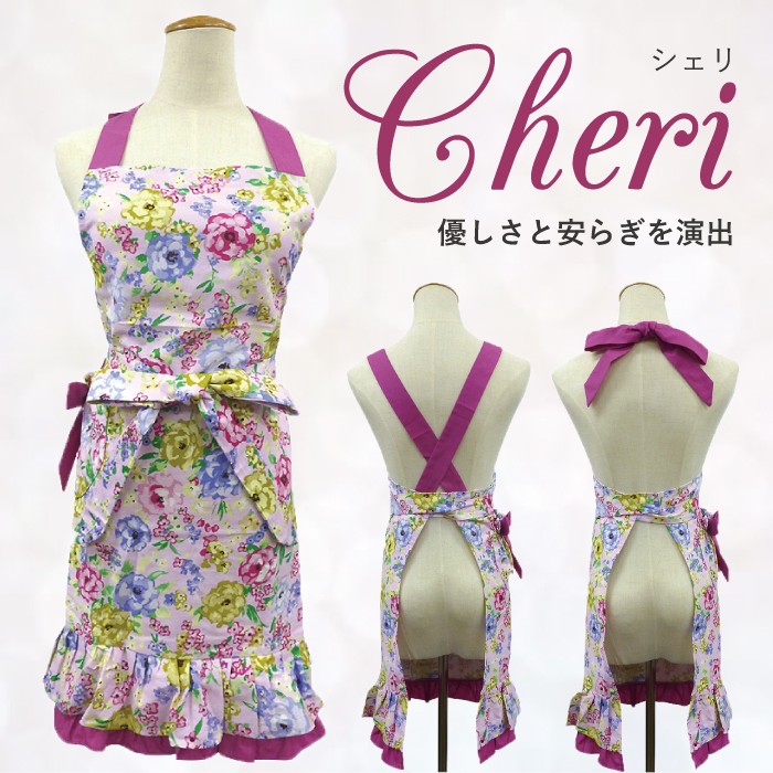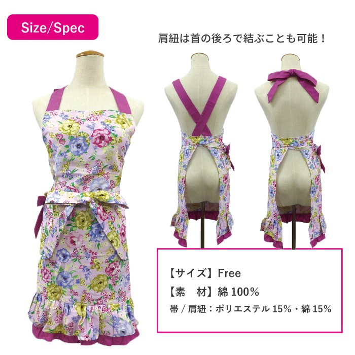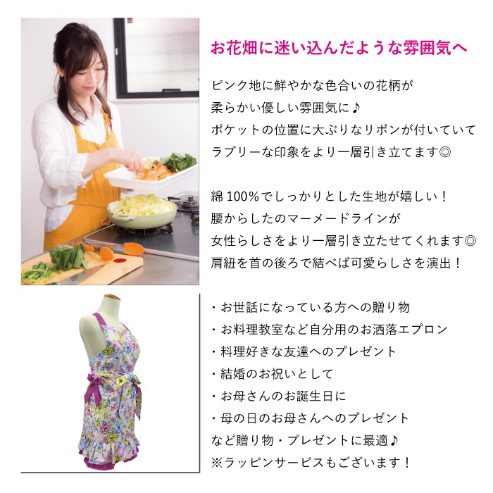 お花畑に迷い込んだような乙女の雰囲気を演出し、 優しさと安らぎを与えてくれるおしゃれで可愛いワンピースエプロンです。 ■サイズ フリー 着丈(胸元から裾まで) : 約71cm  ウエスト : 約71cm 腰紐(片側) : 約96cm ■材 質 綿100% 帯 肩紐 : ポリエステル85% 綿15%