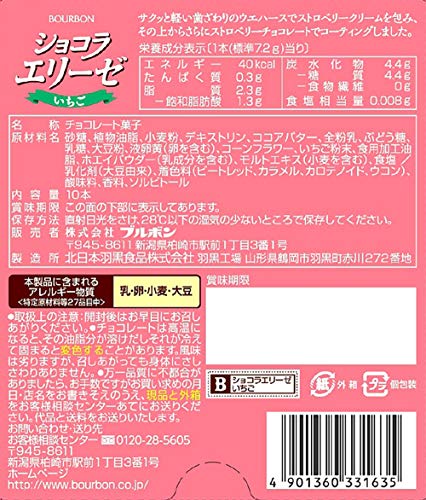 原材料:砂糖、植物油脂、小麦粉、デキストリン、ココアバター、全粉乳、ぶどう糖、乳糖、大豆粉、液卵黄(卵を含む)、コーンフラワー、いちご粉末、食用加工油脂、ホエイパウダー(乳成分を含む)、モルトエキス(小麦を含む)、食塩 / 乳化剤(大豆由来)、着色料(ビートレッド、カラメル、カロテノイド、ウコン)、酸味料、香料、ソルビトール