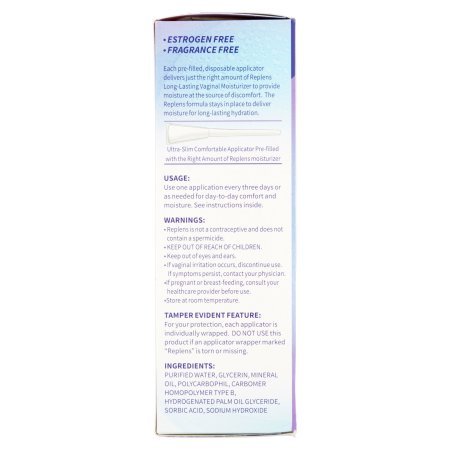 -. Binding : Health and Beauty -. Brand : Replens -. EAN : 0705595778494 -. Feature : Helps replenish vaginal moisture / Ultra-slim and comfortable / Pre-filled with the right amount of Replens moisturizer / Supplements the body's natural lubrication / Lasts up to 3 days -. IsAdultProduct : 0 -. Label : Replens -. LegalDisclaimer : Actual product packaging and materials may contain more and different information than what is shown on our website. We recommend that you do not rely solely on the information presented and that you always read labels, warnings, and directions before using or consuming a product. -. Manufacturer : Replens -. MPN : 104 -. PackageQuantity : 3 -. PartNumber : 104 -. ProductGroup : Health and Beauty -. ProductTypeName : HEALTH_PERSONAL_CARE -. Publisher : Replens -. Studio : Replens -. Title : PACK OF 3 - Replens Feminine Moisturizer, 8ct -. UPC : 705595778494