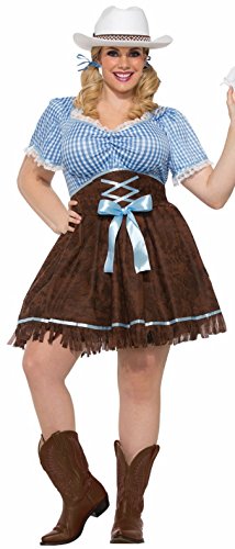 -. Binding : Apparel -. Brand : Forum Novelties -. Department : womens -. Feature : Cowgirl costume includes dress and corset belt / Country dress is blue and white gingham on top with lace trim at neck and sleeve cuffs; brown fringed mini skirt has blue ribbon accent / Plus size fits women with a 42 to 46-inch bust and 38 to 45-inch waist / Complete the look with cowgirl hat, boots and other accessories available separately / Made by Forum Novelties, a leader in costumes and novelty products for more than 30 years -. IsAdultProduct : 0 -. Label : Forum Novelties Costumes -. Manufacturer : Forum Novelties Costumes -. Model : 76066 -. PackageQuantity : 1 -. ProductGroup : Apparel -. ProductTypeName : ADULT_COSTUME -. Publisher : Forum Novelties Costumes -. Studio : Forum Novelties Costumes -. Title : Forum Women's Plus-Size Cowgirl Costume