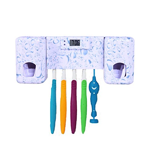 Toothbrush Holder with Double Combination Automatic Toothpaste Dispenser Wekity Toothpaste Holder with Electronic Watch 5 Toothbrushes and Super Sticky Suction Pad For Bathroom(White)