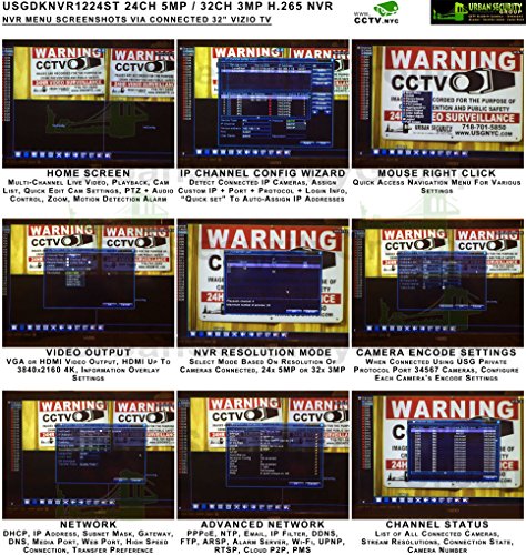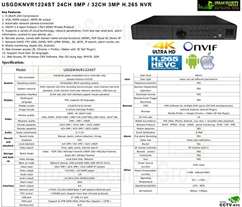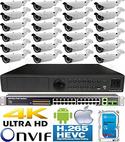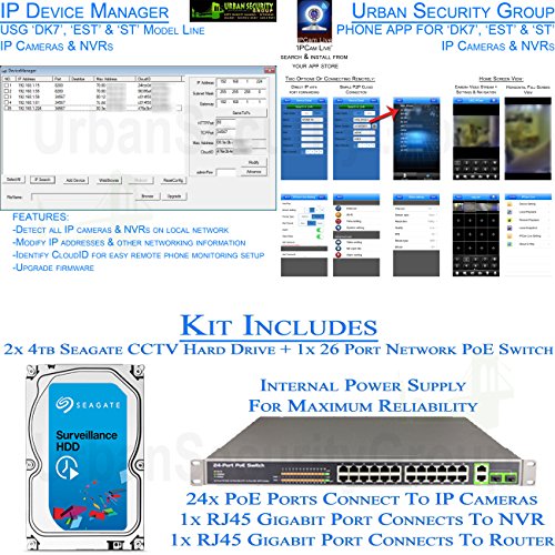 -. Feature : New Generation Of CCTV Video Surveillance ** USG Business Grade H.265 Ultra 4K High Resolution 4MP 24 Camera Security System PoE IP CCTV Kit: 24x H.265 4MP IP PoE 2.8-12mm Manual Vari-Focal Lens Bullet Cameras + 1x 24 Channel H.265 5MP Ultra 4K NVR + 2x Seagate Surveillance 4TB HDD + 1x 26 Port Network PoE Switch / NVR: 24 Channels @ 5MP 2592x1944 or 4MP 2592x1520 / 32 Channels @ 3MP 2048x1536 ** ONVIF 2.4 Profile S & G ** Video Output HDMI 4K 3840 x 2160 / VGA 1080P ** Max 4x 6TB HDD ** Audio In+Out ** Alarm In+Out ** RS485 ** Gigabit RJ45 Network Port ** 3x USB ***** RTSP + ONVIF + P.R.Ivate Protocol Streaming ** Set Main-Stream To H.265, Sub-Stream To H.264 For Phone Viewing ***** Windows PC Use CMS Software / Mac Computers, iPhones, Tablets Use 'vMEyeSuper' or 'IPCam Live' App) / Cameras: H.265 Business Grade 4MP Ultra High Definition Resolution ***** 4MP @ 15fps / 3MP @ 30 Frames Per Second For Real Time Smooth Video ** HD 2.8-12mm Varifocal Lens ** IEEE802.3af Power Over Ethernet ** IP66 & NEMA 4x Vandal + Weatherproof Rated For Outdoor and Indoor Use ***** 42x IR LEDs For 130 Feet Max Range Of Nighttime Protection / Kit Also Includes: 2x 4TB Seagate Surveillance Hard Drive + 1x 26 Port Network Gigabit PoE Switch (24x PoE + 2x Uplink RJ45) ** Cables & TV/Monitor NOT Included! / Why 'Urban Security Group' Brand & Seller? Because We Are The ONLY Merchant That Offers: 90 Day No-Questions-Asked Return Policy ***** 3 Year Warranty ***** Lifetime USA Customer Support ***** Don't Be Fooled By Our Foreign Competitors With Same Camera & NVR Housing But Inferior Components & Poor Quality Controls!