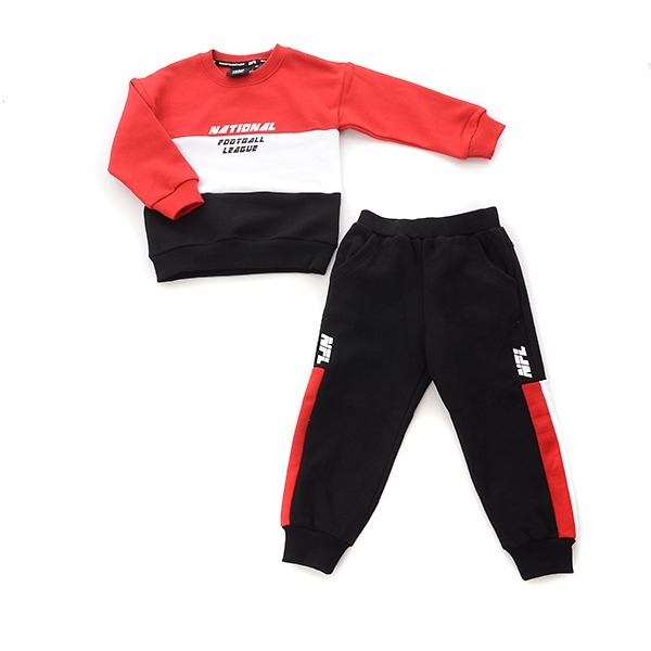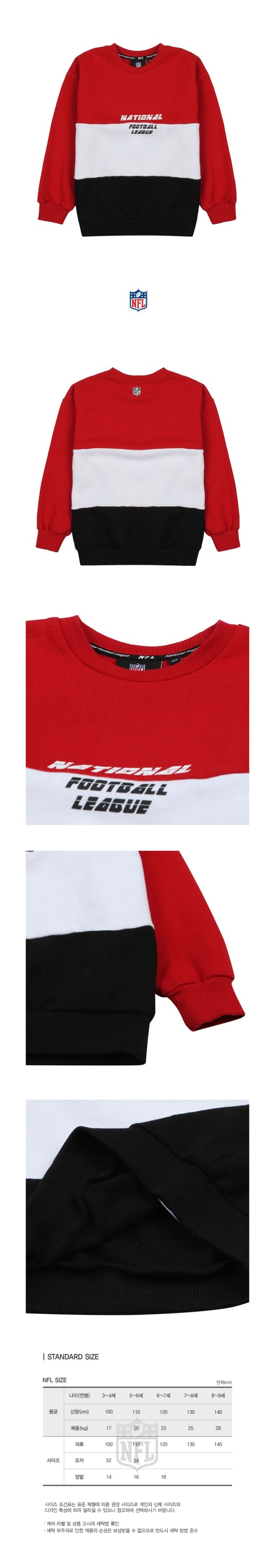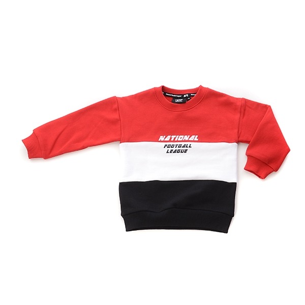 3단 컬러블록 드롭 소매 맨투맨 티셔츠.앞 절개 위 데터링 나염과 뒷 NFL 엠블럼 나염이 포인트.속 기모가 있어 따뜻하며 P11 외 다양한 하의와 코디가능.