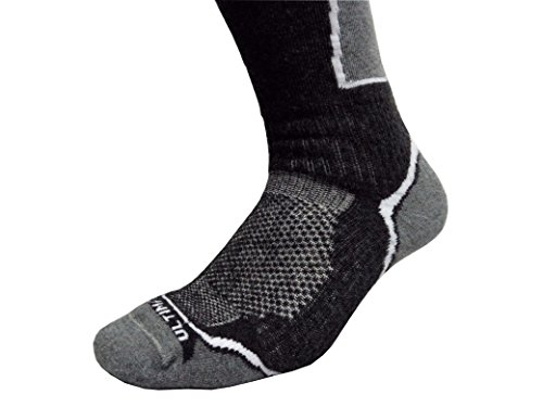 -. Binding : Apparel -. Brand : Ultimate Socks -. Color : Black -. Department : mens -. Feature : HIGHEST MERINO WOOL CONTENT 70%. We don't skimp on the wool to save money. / COMFORT: Midweight cushioning is the perfect balance of cushioning, moisture management, and durability. / SOCK TECHNOLOGY: FLAT KNIT TOE SEAM: Virtually unnoticable even in tight ski boots! ARCH BRACE: Holds the sock in place STAY UP CUFF: No saggy socks here! Ultra smooth cuff stays up! / ULTIMATE KNITTING: Utilizing our unique knit pattern our socks deliver the right amount of cushioning in the toe heel and shin. / ULTIMATE GUARANTEE: 100% guarantee. Love them or we give you your money back. -. IsAdultProduct : 0 -. ProductGroup : Apparel -. ProductTypeName : SOCKSHOSIERY -. Title : Ultimate Socks Mens Midweight Merino Wool Ski Snowboard Warm Socks