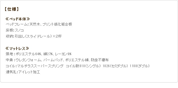 材質:[ベッド]本体-天然木・プリント紙化粧合板、床板-スノコ床板、[マットレス]張地-ポリエステル64%・綿27%・レーヨン9%、中身-ウレタンフォーム・パームパッド・ポリエステル綿・防虫不織布、コイル-マルチラススーパースプリング・コイル数1026、通気孔-アイレット加工