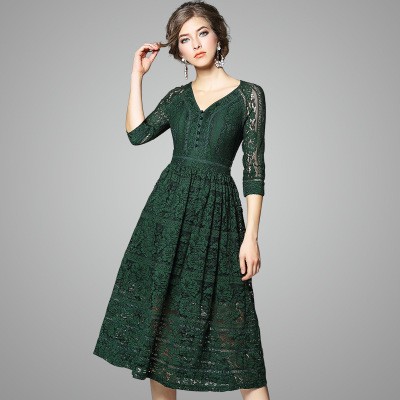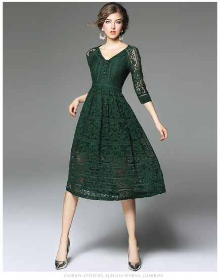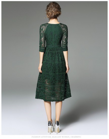ワンピース ミモレ丈 パーティードレス 総レース 透け感 レトロ Aライン 七分袖 Vネック 大人 上品 エレガント 可愛い お呼ばれ デート drgz2255