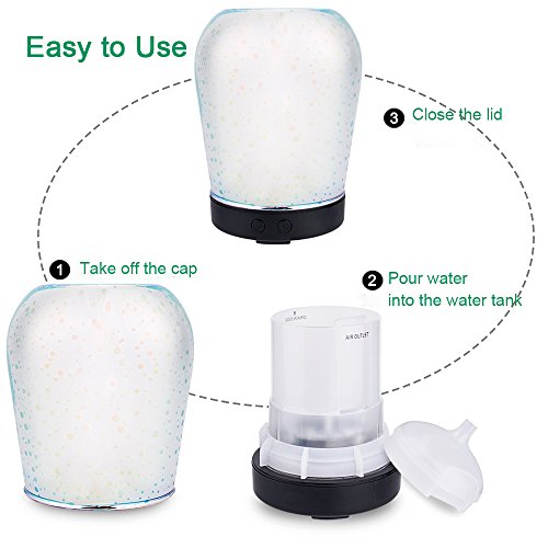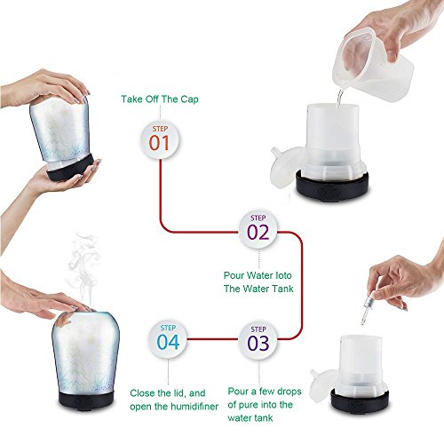 SEVEN COLORS 3D CHANGING LIGHTS - Aromatherapy oil diffuser is designed with 7 colors 3D changing LED lights, press the right button to turn on the LED light, the color will change automatically from one color to next.