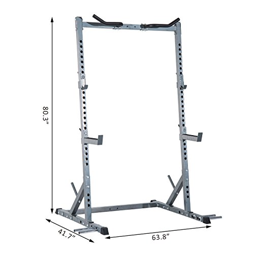 - Feature : Helps weightlifters exercise safely and efficiently / Wide walk-in design offers plenty of side-to-side movement / Side pegs for holding plates, hooks for barbell storage and two spotter arms / Ideal for back, front and overhead squats as well as for deadlifts, cleans, thrusters and other lifts / Overall Dimensions: 63.8"L x 41.7"W x 80.3"H