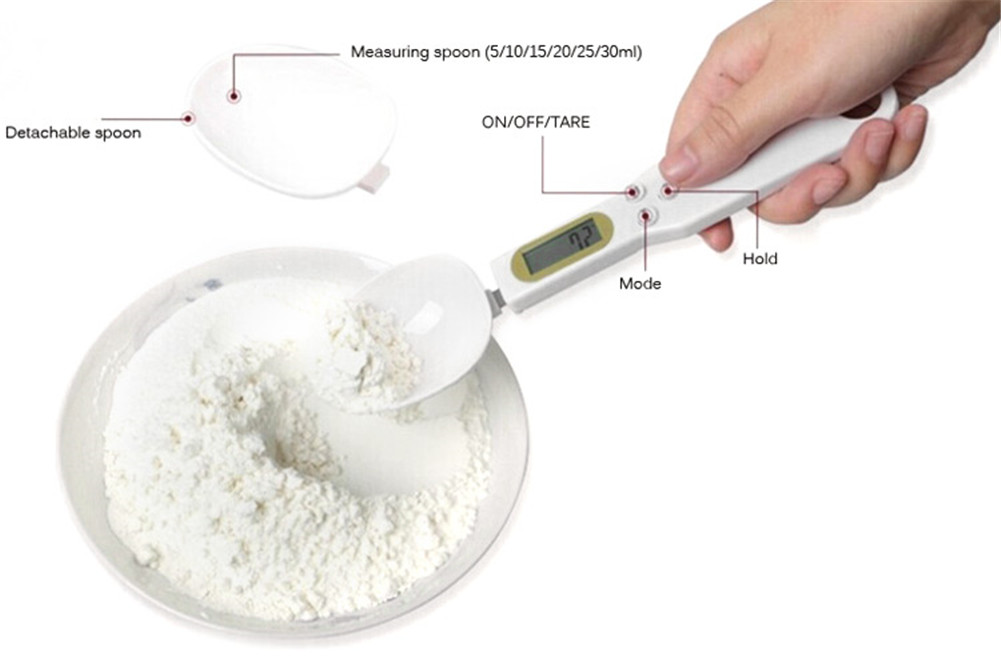 Tare function: Put the container of items in the spoon and press the ON / OFF / TARE button, then put the items in the container and the LCD will shows the net weight