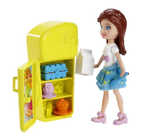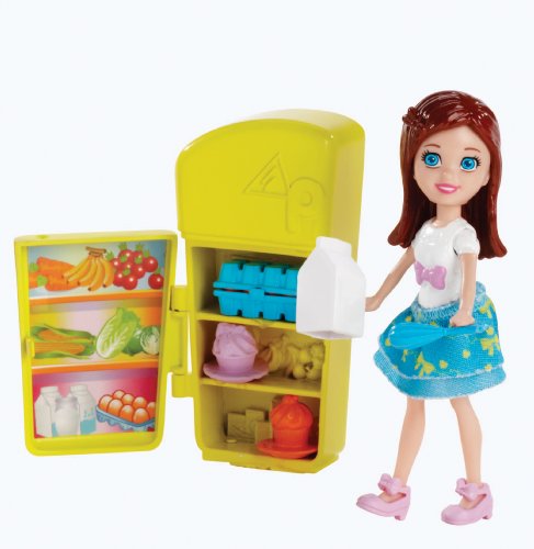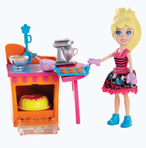 Mmmm - can you smell the cookies? Polly and Lila dolls have been raising the heat in the kitchen, baking up a bakery-full of treats. With an oven/range and refrigerator, these two friends plan to master the culinary art. “Stir” up icing on the stove while “mixing” batter with the mixer. It sits on the handy shelf attached to the unit and is the perfect spot to hold the bowl of batter or a tasty treat. Open the oven door to pop in the cookies on their tray, or store the cupcakes molded onto their plates in the refrigerator - its door opens and closes too! And just imagine the event for which the three-tier pink cake has been made. Both dolls will bring sweetness to any party bearing their treats and wearing adorable outfits that include trendy tops, full skirts with charming prints and pretty matching shoes. Wearing their removable baking mitts (one for each doll), these mini-bakers are ready to turn up the heat! Includes refrigerator, oven/range/shelf, Polly Pocket doll, Lila doll and themed accessories.Feature