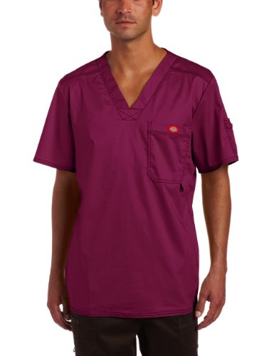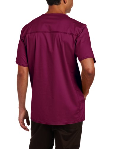 - V-neck scrub top featuring chest pocket with elastic bungee loop, short sleeves, and multi-needle topstitching