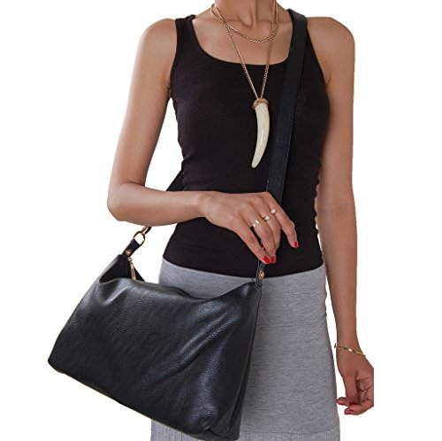 -. Feature : This vegan leather bag can be carried over your shoulder or as a cross-body; Gold-tone hardware and adjustable strap / Vegan leather, a high quality PVC synthetic that wears like leather / Approx. Measurements: 14 inch x 11 inch x 5 inch / Gold-tone hardware and 100% polyester lining / Made in China