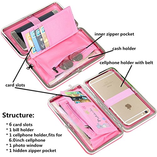 - Structure: 6 Card Slots, 1 ID display Window, 1 zippered pocket, 1 bill holder, 1 cellphone compartment with elastic belt to protect your phone from physical damage. Great wallet for smartphone, cash, keys, coins, receipt, passport. The wallet has a detachable hand strap for carrying convenience.