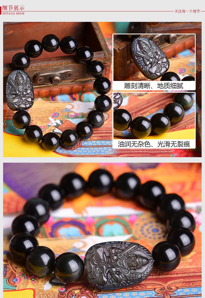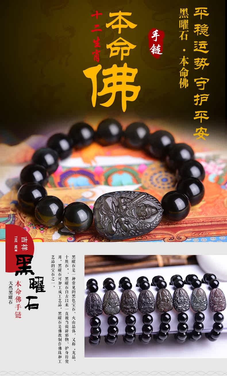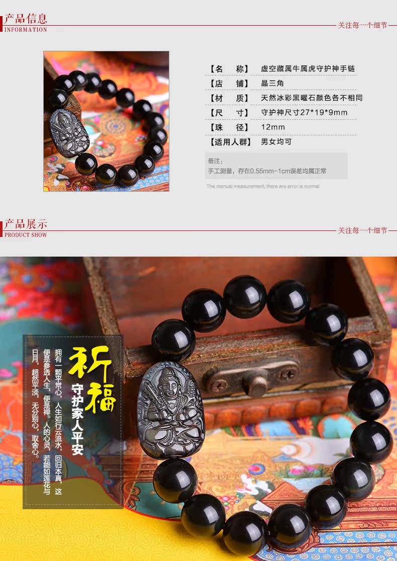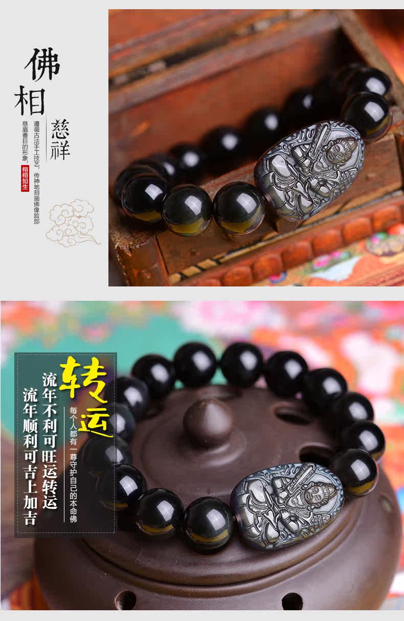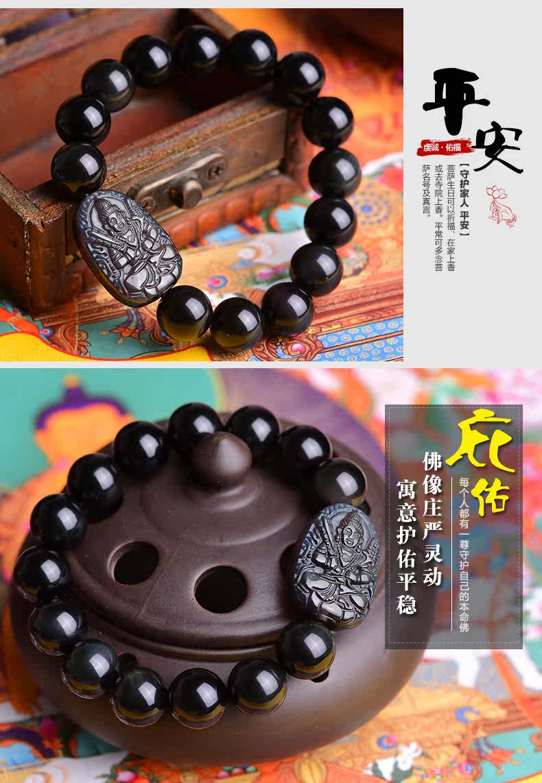 开光天然黑曜石虚空藏菩萨手链 十二生肖属牛虎本命佛守护神手串