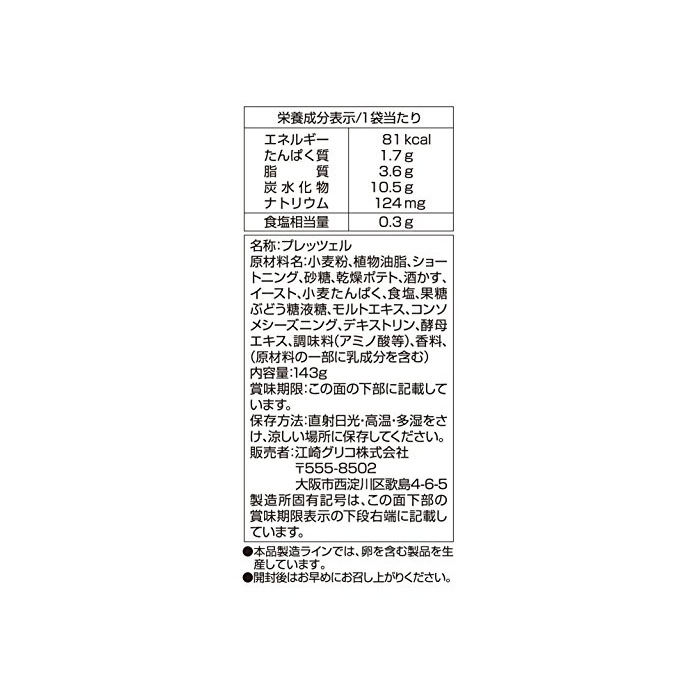 내용량:143g'원재료:소맥분,식물성 기름지,쇼트닝,설탕,건조 포테이토,술찌꺼기,이스트,밀 담백,식염,과당 포도당액당,몰트 엑기스,consomme seasoning,덱스트린,효모 엑기스,조미료(아미노산등)고, 향료,(원재료의 일부에 유성분을 포함한다)'상품 사이즈(높이x(길이)깊이x폭):150.0mmx240.0mmx42.0mm