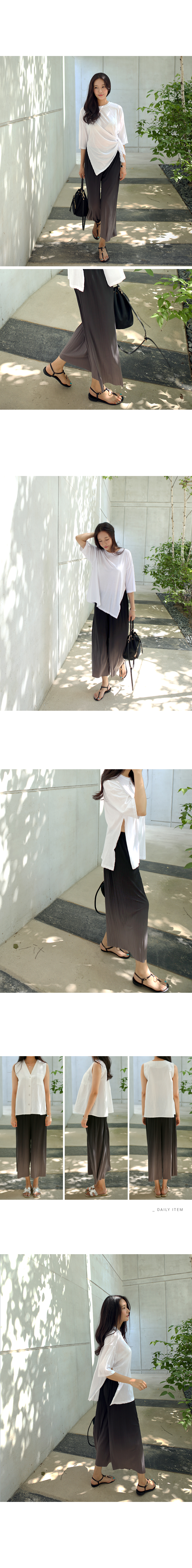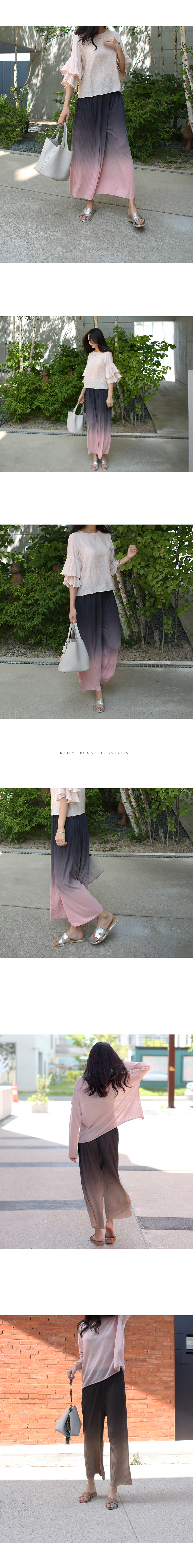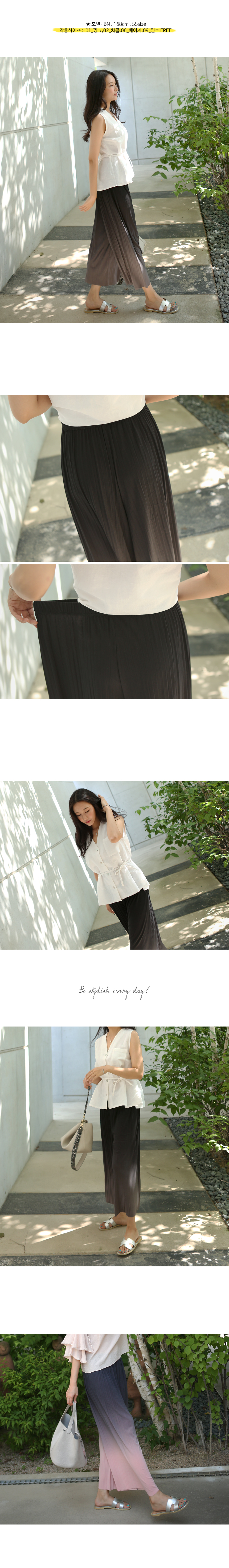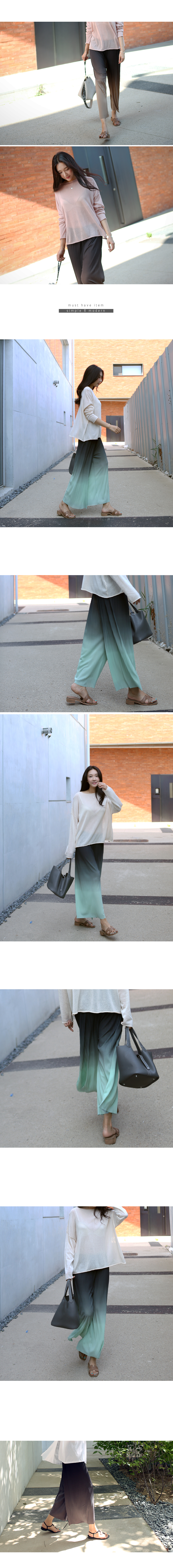 그라데이션 염색으로 독특하고 멋스러운 컬러감이 포인트가 되어주는 전체허리밴딩 플리츠소재의 와이드팬츠에요