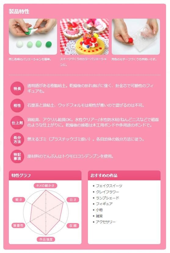 透明感、透過性のある高級樹脂粘土です。乾燥後の折れや曲げに強く、乾くと耐水性になります。特性を活かして、花びらや光を通すランプシェードなどに最適♪もちろん、スイーツデコなどの制作には欠かせない素材となります。作品は丈夫で長持ちします。 |