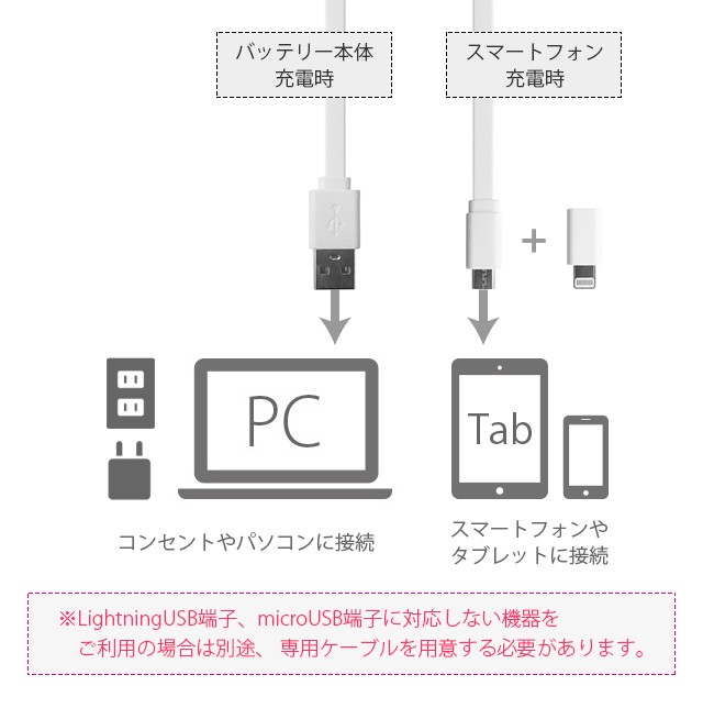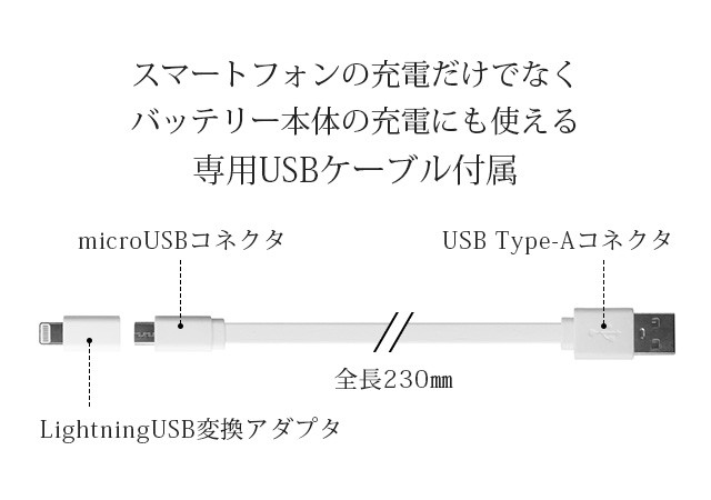 | 仕様 | [バッテリー容量]4000mAh [重量]121g [使用回数]約500回 [入力電圧]DC SV/1A [入力端子]microUSB [出力電圧]DC SV/1A [出力端子]USB1口 [寸法]縦縦123mm × 横58mm × 厚さ11mm [付属品]microUSBケーブル 1個 LightningUSB変換アダプタ 1個 |