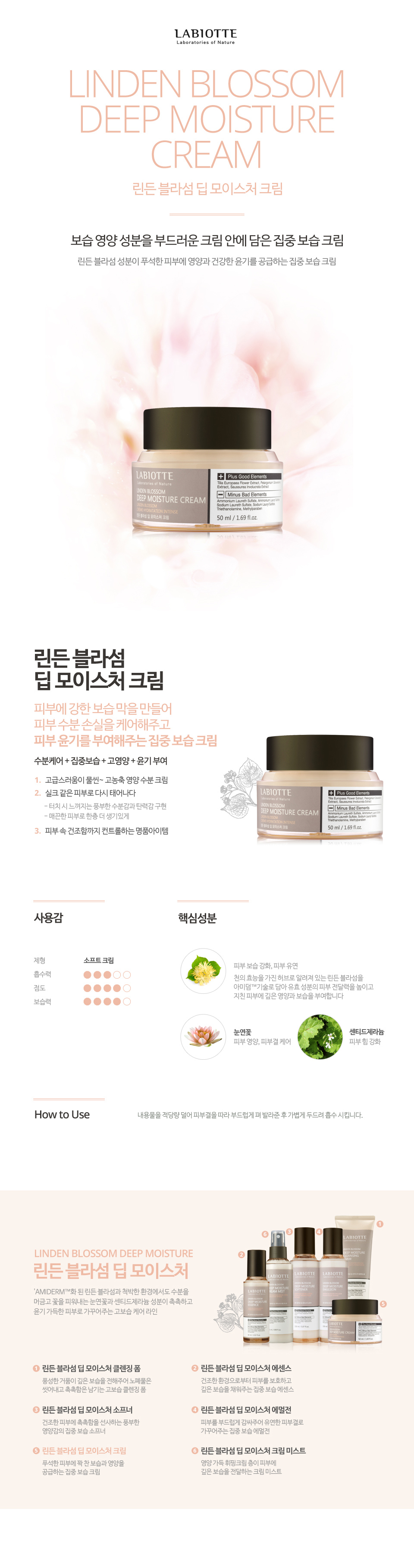 정제수, 사이클로펜타실록산, 글리세린, 디메치콘, 메칠프로판디올, 트레할로스, 하이드로제네이티드폴리(C6-14올레핀), 디메치콘/비닐디메치콘크로스폴리머, 식물성오일, 글리세릴스테아레이트, 피이지-100스테아레이트, 세틸알코올, 쉐어버터, 행인오일, 카바잎/뿌리/줄기추출물, 눈연꽃추출물, 린덴꽃추출물, 느릅나무뿌리추출물, 줄맨드라미씨추출물, 꽃박하잎추출물, 다마스크장미꽃추출물, 레몬밤잎추출물, 레몬버베나잎추출물, 로즈마리잎추출물, 마시멜로잎추출물, 말로우잎추출물, 바오밥나무씨추출물, 박하잎추출물, 보리지추출물, 세이지잎추출물 ,센티드제라늄추출물, 시계꽃추출물, 오레가노잎추출물, 월계수잎추출물, 유칼립투스잎추출물, 자주천인국추출물, 카렌둘라꽃추출물, 캐모마일꽃추출물, 회향잎추출물, 하이드로제네이티드레시틴, 소듐하이알루로네이트, 1,2-헥산디올, 소듐폴리아크릴레이트, 트리데세스-6, 폴리소르베이트20, 피이지/피피지-18/18디메치콘, 부틸렌글라이콜, 알란토인, 카프릴릭/카프릭트리글리세라이드, 토코페릴아세테이트, 에칠헥실글리세린, 레시틴, 서양유채스테롤, 슈크로오스라우레이트, 에탄올, 폴리글리세릴-2카프레이트, 세라마이드3, 트리에칠헥사노인, C12-20알킬글루코사이드, C14-22알코올, 라이소레시틴, 이소세테스-10, 이소세테스-25, 하이드로제네이티드폴리데센, 콜레스테롤, 세테아릴알코올, 포스포리피드, 소듐아스코빌포스페이트, 피토스핑고신, 세라마이드2, 디소듐이디티에이, 향료, 페녹시에탄올