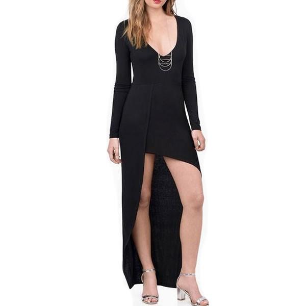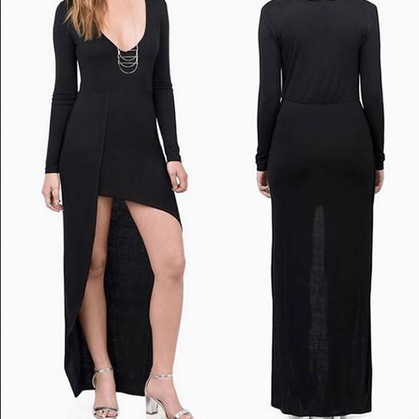| セクシー テロ素材 深Vネック ワンピース ミニ丈 無地 黒 ブラック 【ワンピース レディース 女性 ロンデルブラック ワンピース ミニ丈 アシンメトリー テールカット 変形デザイン ワンピース ドレス one-piece】 | |