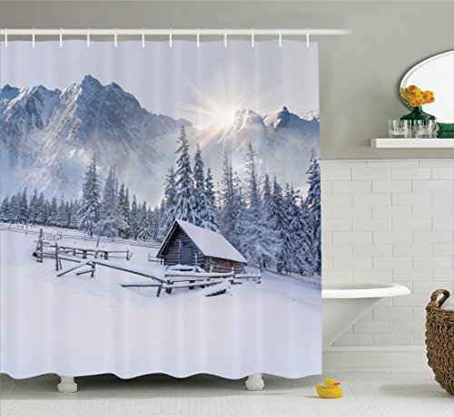 Ambesonne Apartment Decor Collection, Old Farm House by the Mountain in the Winter Season Cold Times in Rural Nature Scene Photo, Polyester Fabric Bathroom Shower Curtain Set with Hooks, White