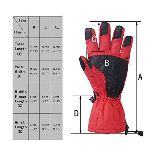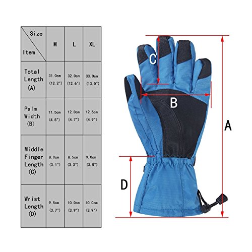 -. Feature : Waterproof, Windproof and Breathability: The outside shell keeps snow and water outside, and the interior layers is automatically moisture wicking when hands sweat. / Premium Thermal Performance: This is very thick and light weight gloves. Extremely warm in cold weather when skiing, snowboarding, biking and motorcycle etc. / Zippered Pocket Design is easy to carry keys, cards or some cash and other accessories. Thumb Back is with soft lens wiper fabric. / Soft PU, PVC palm and reinforced fingers ensures strong and flexiable hand grip. It is more durable use when doing exercise in winter. / Buckle Wrist Strap is for comfortable and custom fit,the drawstring closure is adjustable to prevent snow and wind outside.