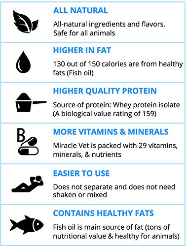 CONTAINS THE MOST FAT: Miracle Vet contains 150 calories per ounce. 130 of these calories are from healthy fats.