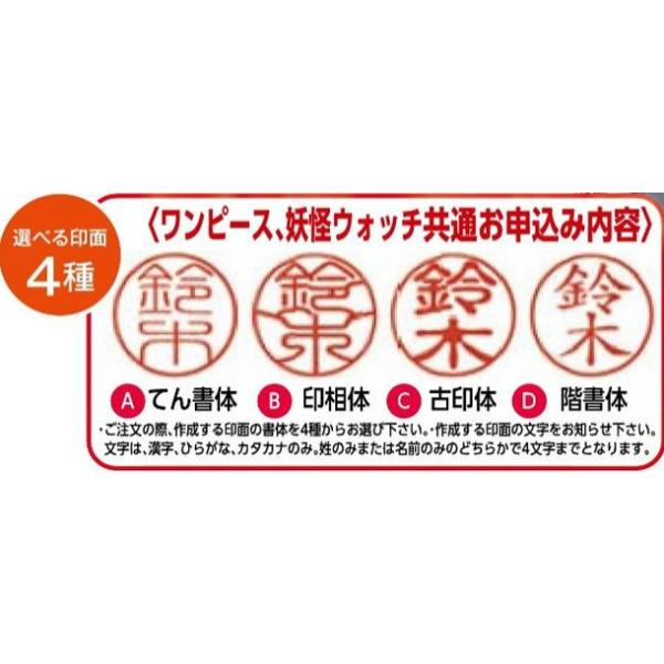 ※※ご注文頂いてから製作致しますので、お届けまで1週間~10日前後お待ち下さい。ワンピース15周年限定本格印鑑セット登場! 柄は9人のキャラクターから選べるぞー!さらに書体も4種から選べるぞー!印鑑、印鑑ケース、特製収納箱入りの特別仕様! 銀行印としても使える!ご希望の書体にて作成してのお届けです。 ・ご注文の際、作成する印面の書体を4種からお選び下さい。・作成する印面の文字内容を必ず備考欄等に入力願います。 文字は、漢字、ひらがな、カタカナのみ。姓のみまたは名前のみのどちらかで4文字までとなります。「妖怪ウォッチ印鑑セット」もあります。こちらをクリック