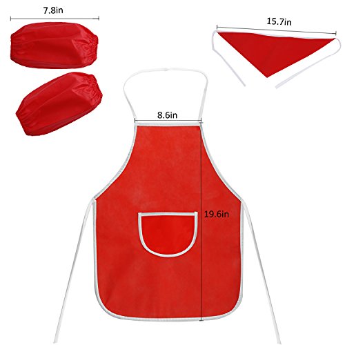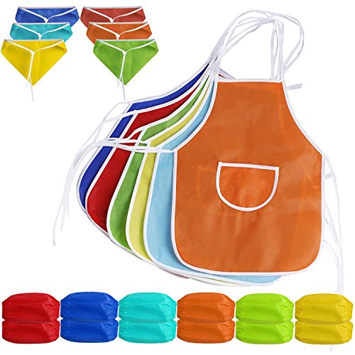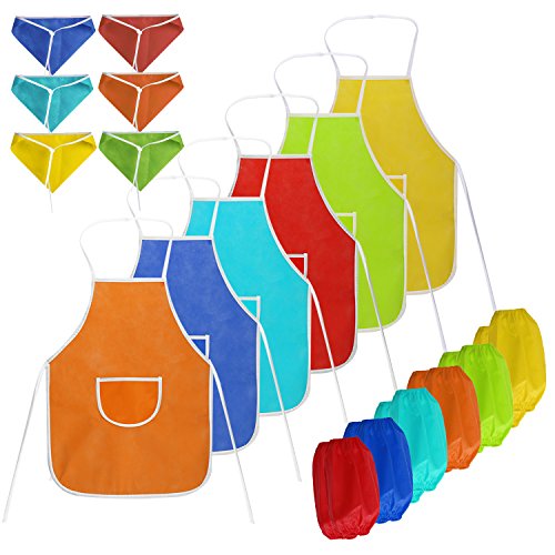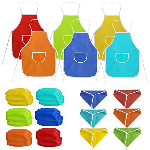 6 aprons, 6 chef hats and 6 pair of oversleeves for kids to enjoy painting in school or at home or cooking in kitchen.