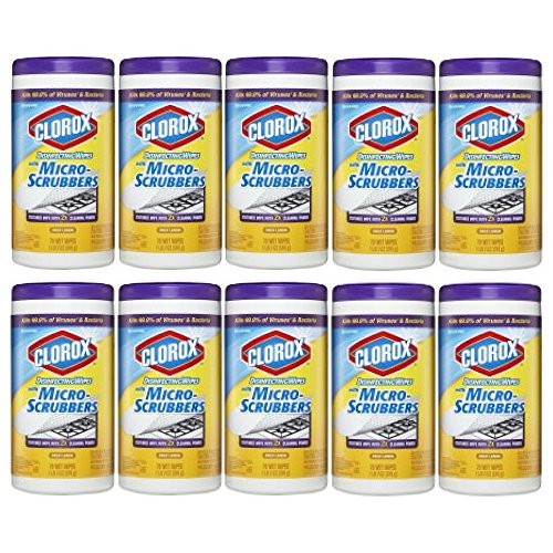 -. Feature : One 70 count canister of Clorox Disinfecting Wipes with Micro-Scrubbers in Crisp Lemon / Kills 99.9% of virus and bacteria, including Human Coronavirus and Influenza A2 virus / Kills cold and flu viruses, E. coli, Staph, Strep, Kleb and Salmonella / Double sided texture with micro-scrubbers trap and remove tough soap scum / Wipes eliminate soap scum and baked on soils on multiple surfaces