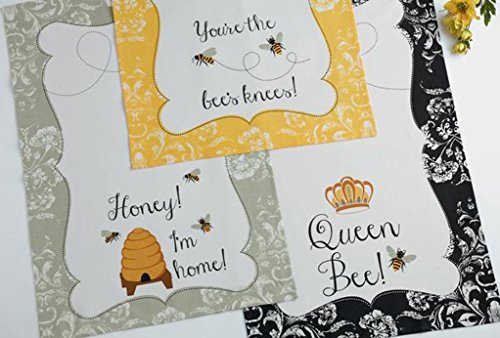 - The set includes “Honey I’m Home!” in gray, “You’re the Bee’s Knees” in yellow and “Queen Bee” in black