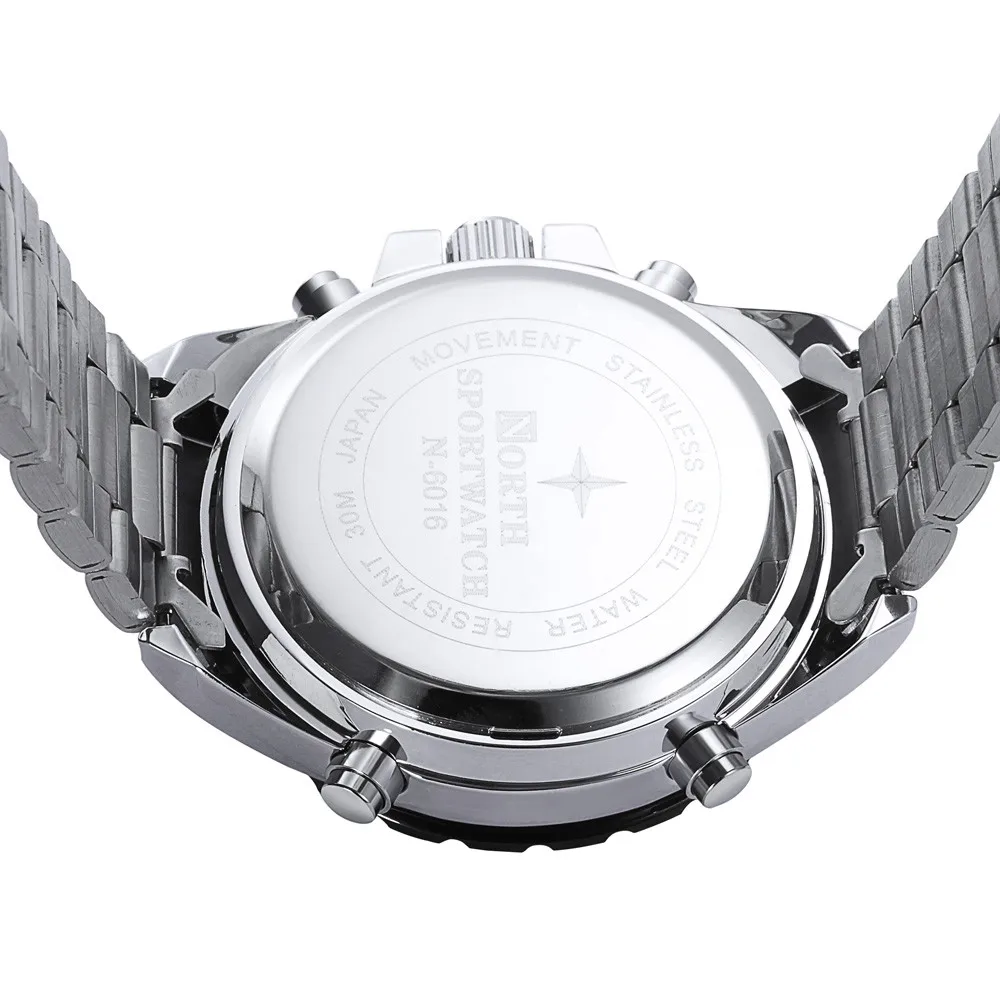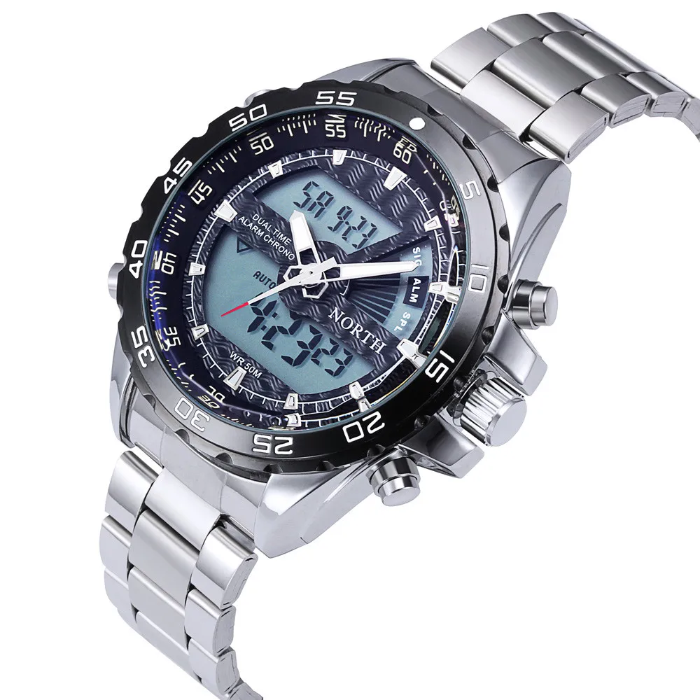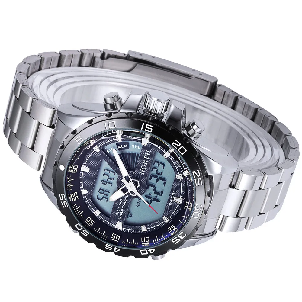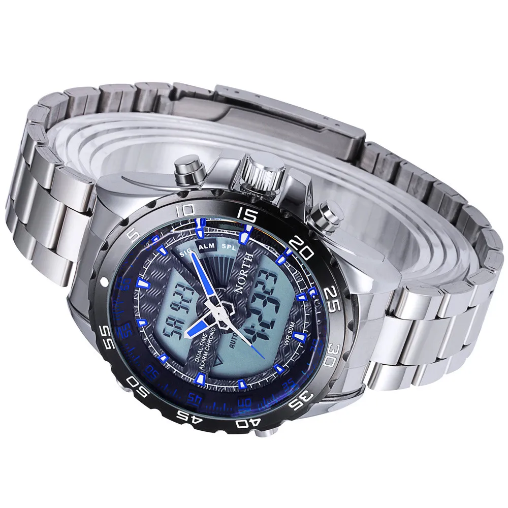 시계 남자 북미 더블 운동 석영 손목 시계 럭셔리 브랜드 스테인레스 스틸 남성 시계 실버 높은 품질 선물 상자