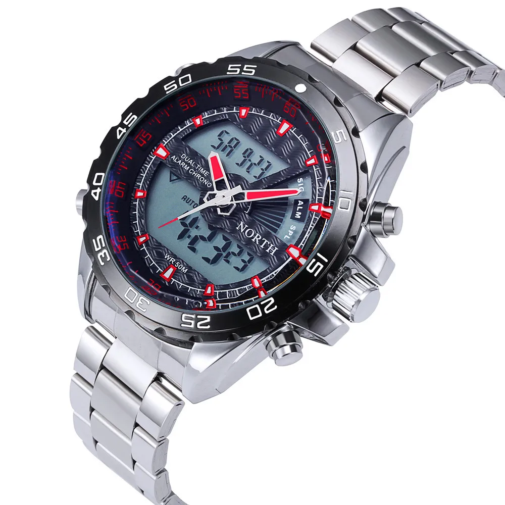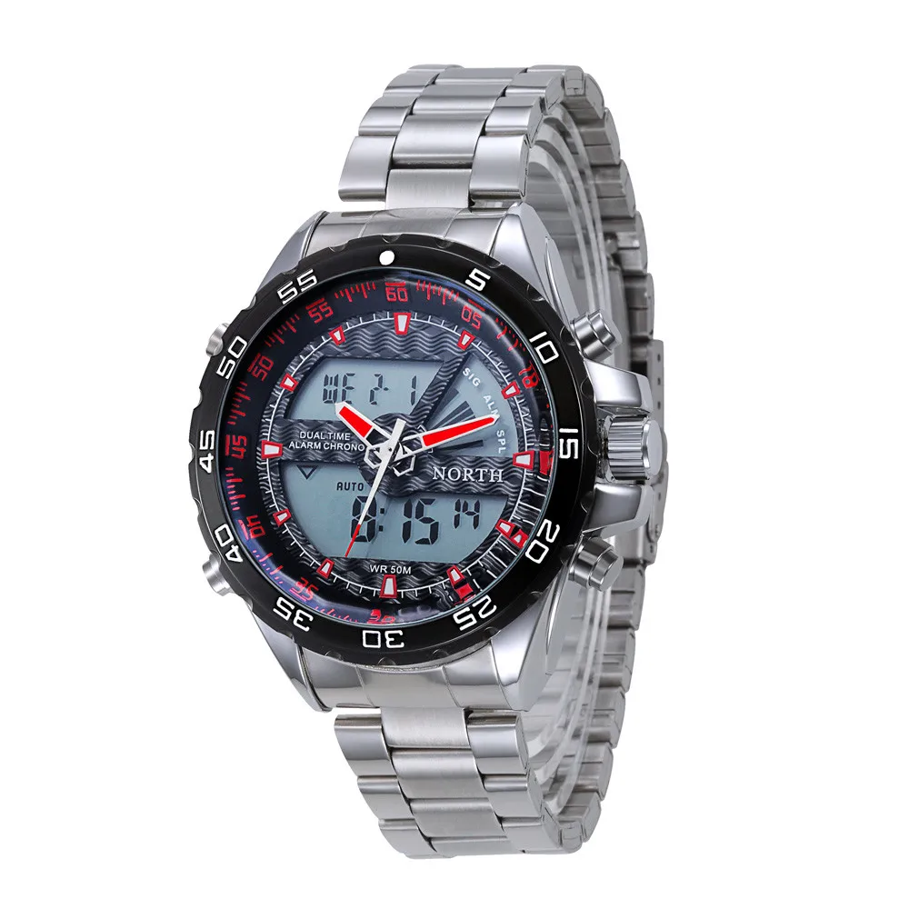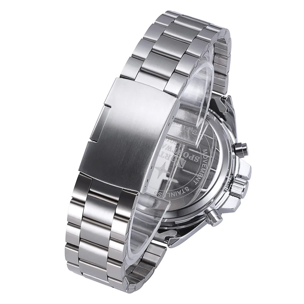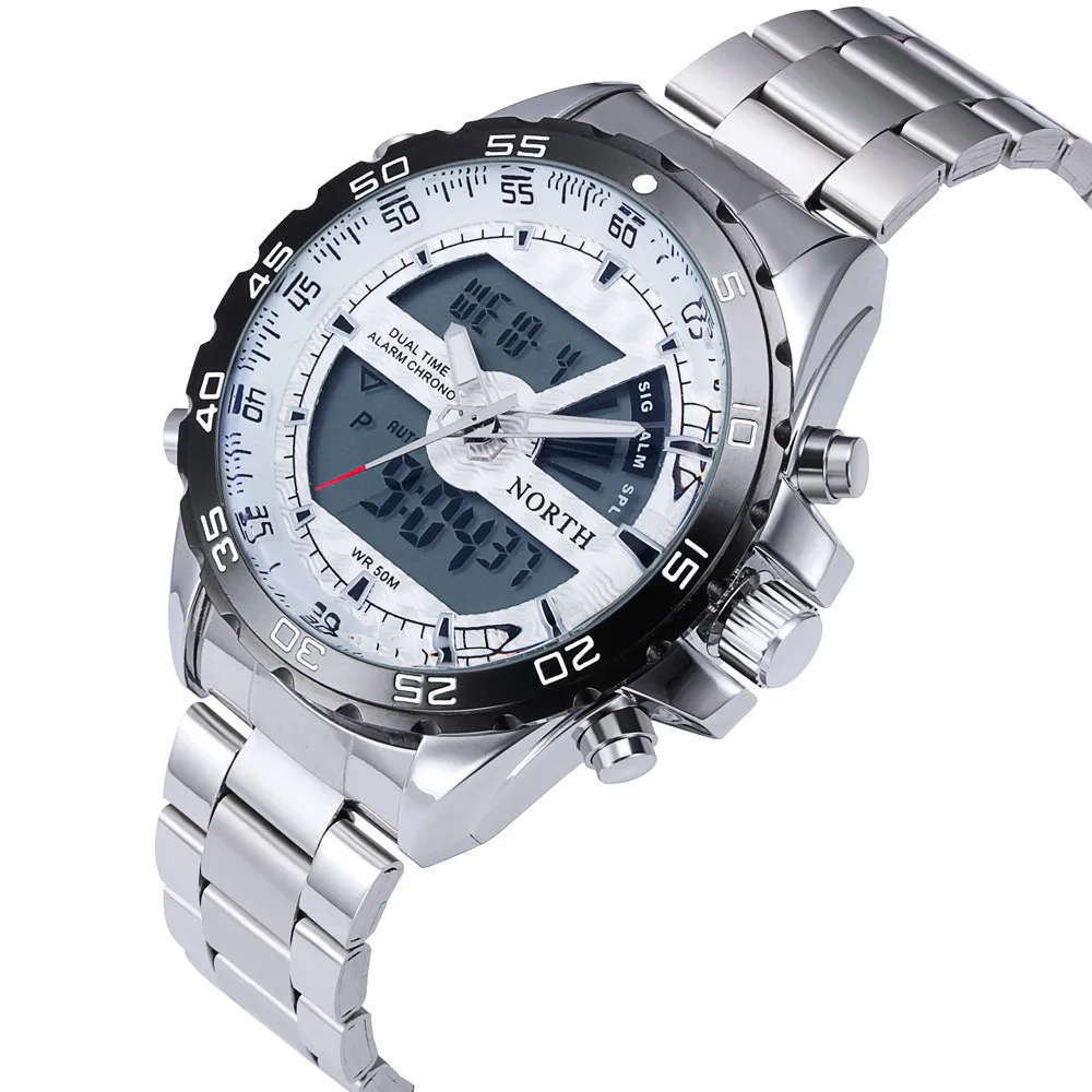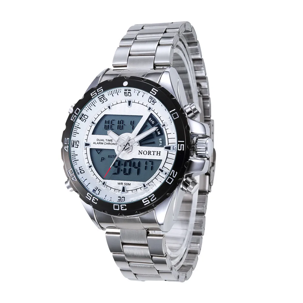 시계 남자 북미 더블 운동 석영 손목 시계 럭셔리 브랜드 스테인레스 스틸 남성 시계 실버 높은 품질 선물 상자