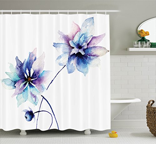Watercolor Flower Decor Shower Curtain by Ambesonne, Elegant Flower Drawing with Soft Spring Colors Retro Style Floral Art, Fabric Bathroom Set with Hooks, 69W X 70L Inches Long, White Purple and Blue