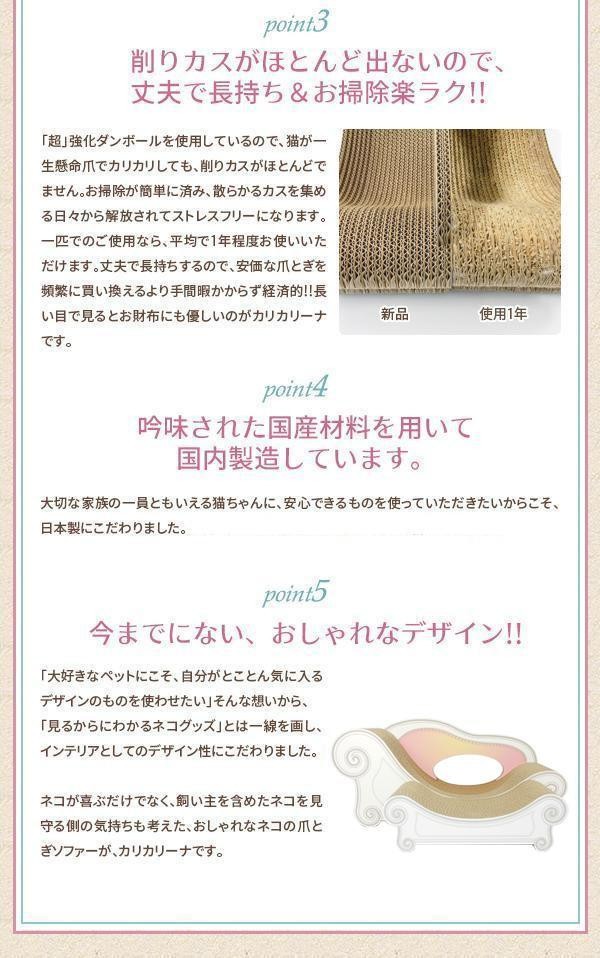 | 猫をこよなく愛す方々の猫ちゃんたちから情報を収集し「ネコがリラックスするカタチ」を研究、構築した「にゃん工学」に基づいた設計のおしゃれな爪とぎソファーとコンパクトで丈夫なスツールのセットです。削りカスがほとんど出ない国産の強化ダンボールを使用し、国内で製造しているので大切な家族の一員に安心してお使いいただけます。お部屋のインテリアに合わせてお選びいただけるよう、5色をご用意しました。 |