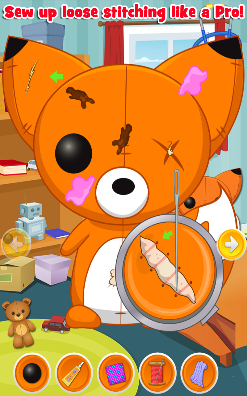- Feature : Features over 7 unique and gorgeous, illustrated Stuffed Animals in need of repair including a dragon, bear, bunny, grumpy cat, fox, owl, and doll! / Cute animations and toy box make this game come to life! / Variety of tools to master including the sewing kit, patches, eye and nose replacement, gum removal and more!! / Stickers, Candy and a Medley of things to decorate your stuffies with at the end of the game! / Easy to use interface - any kid can pick up and play this game!