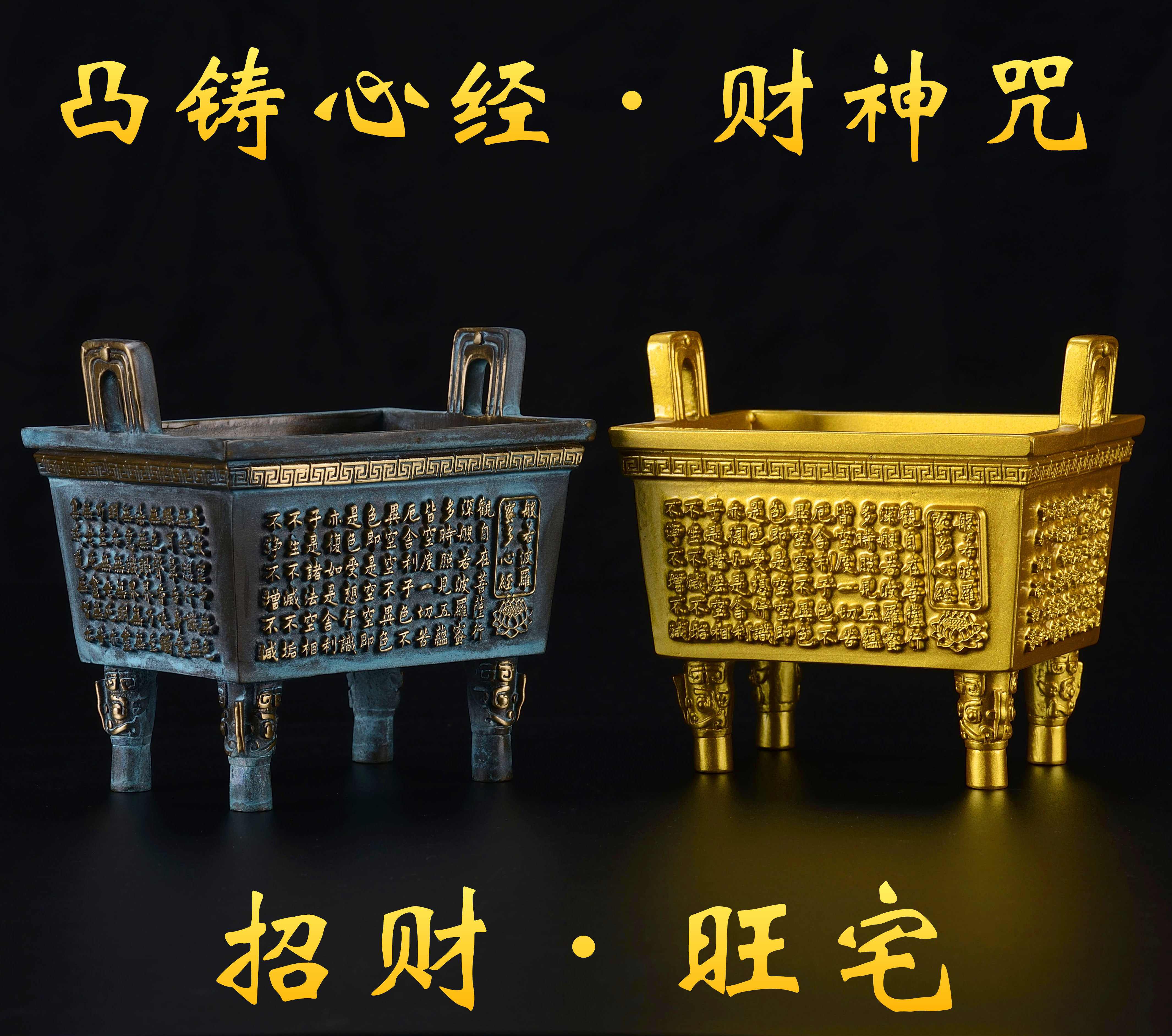 心经,全名般若波罗蜜多心经,是一部伟大的佛教经典,全文仅二百余字,却囊括了600卷《般若波罗蜜经》的精华核心,是古今未来一切菩萨成就无上智慧的必修之法,为无数人所反复书写、阅读和体悟。 唐代书法大家欧阳询,其所书心经,就成为了流传千古的名作,是后人临摹学习的楷模。宝鼎所铸心经,采用欧阳修所书心经字体,具有独特的艺术性和观赏性,能彰显出主人家的文化内涵和高雅品味。宝鼎内铸有黄财神咒轮。