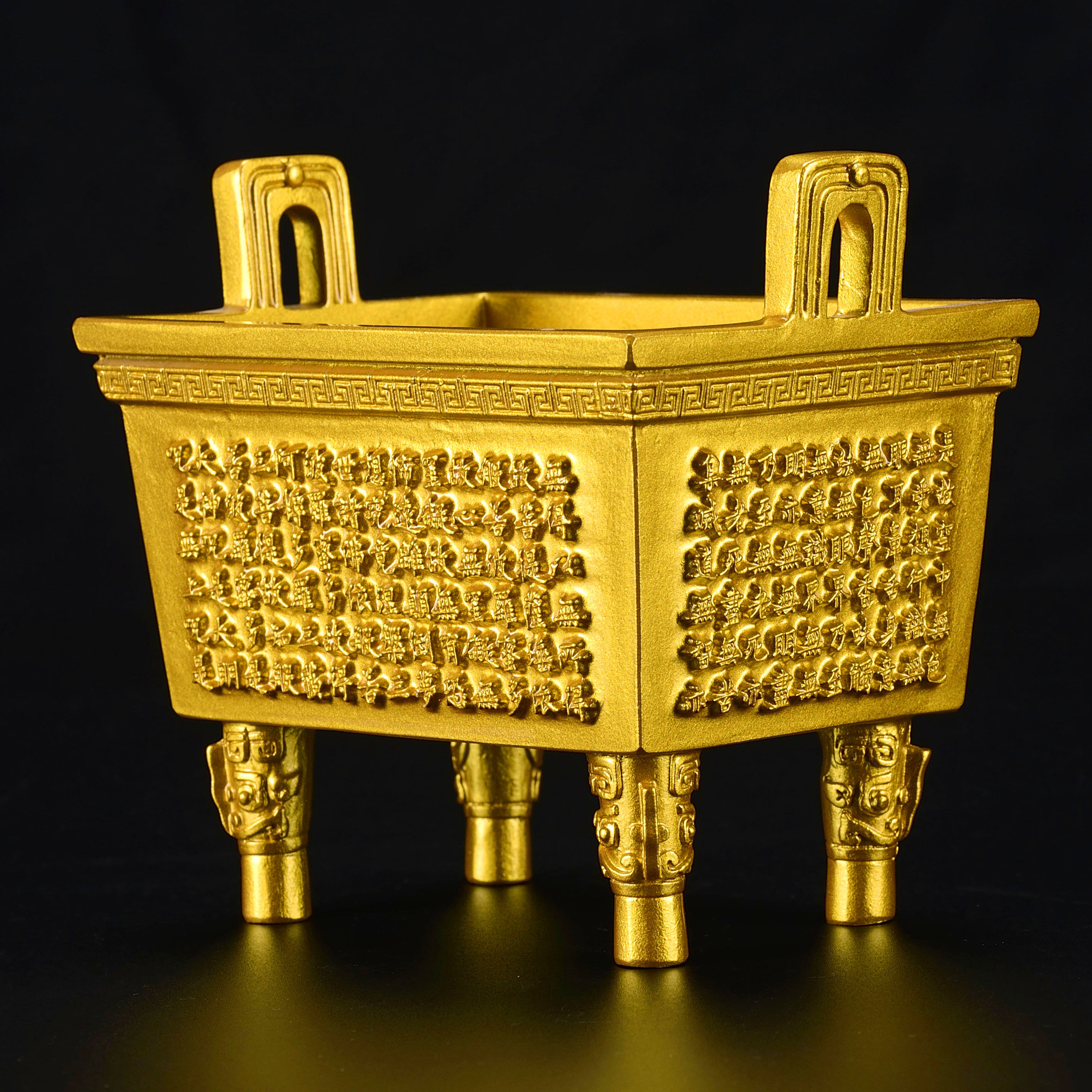长约12厘米,宽约9厘米,总高约12厘米,重约一公斤,纯黄铜铸造。有仿古青铜和金色两种工艺。