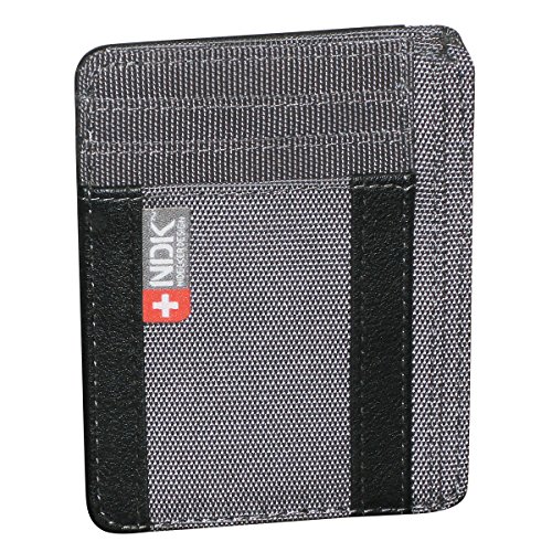-. Feature : Exterior ID Window and Card Pockets / Gusseted Sleeve - RFID Protective lining / Faux Leather Trim Durable 1200D Polyester / Exterior Signature NDK Logo Tab / Dimensions: 4.25" x 3.25" x .25" Weight: 0.15 oz.