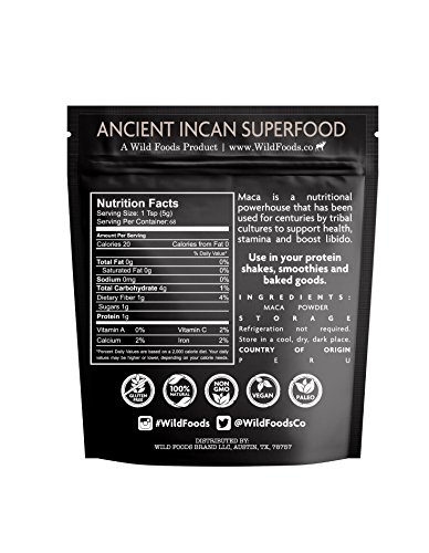 -. Feature : Powerful Nutrition - Another raw superfood from South America, Maca powder is a nutritional powerhouse that has been used for centuries by tribal cultures to support health, stamina and boost libido. It has also been shown in studies to positively affect memory and mental performance. / Nutrient Powerhouse! Over 20 amino acids, including 8 essential, 20 free-form fatty acids, Vitamins B1, B2, C, E, Calcium, Magnesium, Potassium, Copper, Zinc, Manganese, Selenium, Sulphur and iron. Maca is also rich in phytonutrients. / Maca powder is known to increase energy and performance. Try it as a pre-workout or in your morning butter coffee brew to help you crush the day! / Add to Smoothies, Shakes, and Baked Recipes! This caffeine-free natural source of energy is perfect for all kinds of uses. It also makes a great pre-workout addition with water, lemon, honey, Wild Matcha and a dash of Wild Pink Salt! / Buy more, save more with the Wild Discount! Add more Wild products to your cart and save the more you buy. Discounts applied automatically at checkout! Backed by the Wild Foods 100% Happiness Guarantee: If you aren't fully satisfied for any reason, contact our friendly staff to resolve your case!