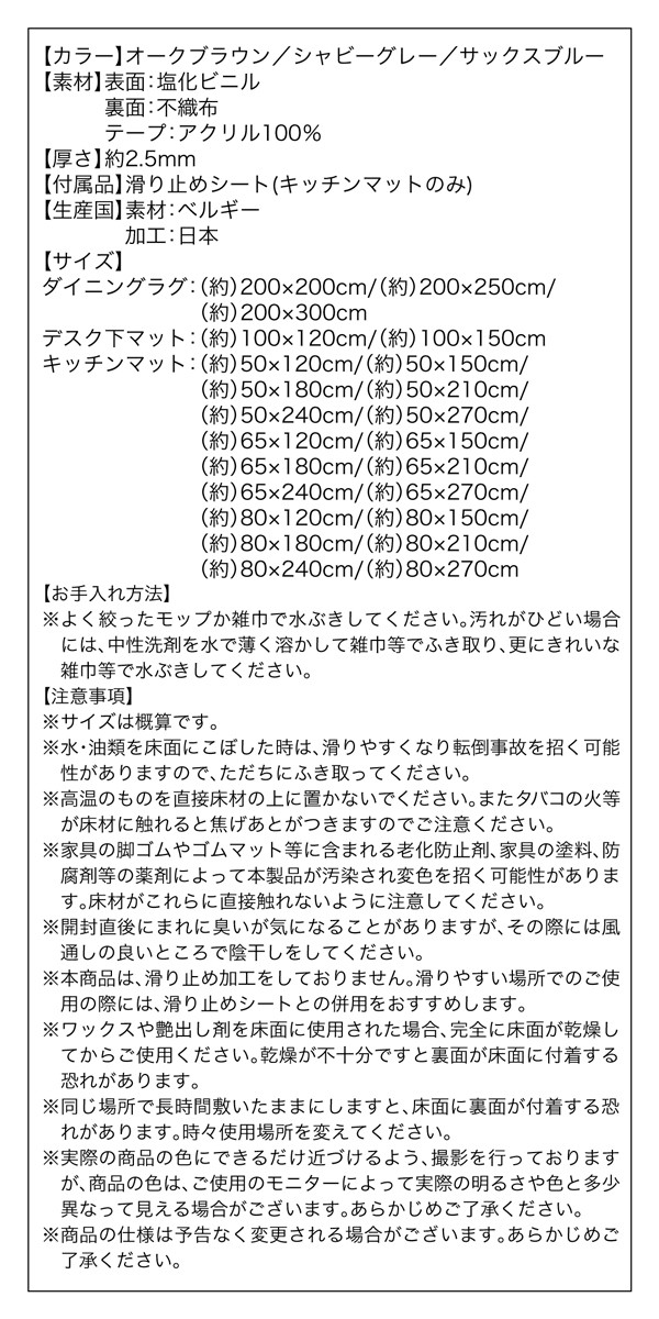 ※同じ場所で長時間敷いたままにしますと、床面に裏面の樹脂が付着する恐れがあります。時々使用場所を変えてください。