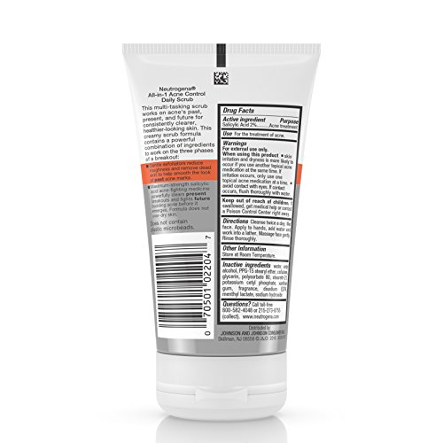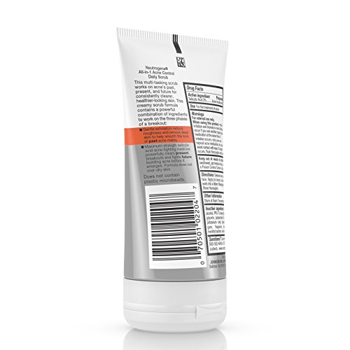 Help treat your past, present, and future acne for consistently clearer skin with Neutrogena All-in-1Acne Control Daily Scrub. Formulated for daily use on acne-prone skin, this creamy formula helps cleanse and exfoliate for a clearer, healthier-looking skin. With naturally derived soy and gentle exfoliators, this scrub helps smooth roughness, and help reduce the look of past acne marks. Maximum-strength salicylic acid clears present breakouts and fights future budding acne before it emerges. The ingredients work together to help treat breakouts without over-drying skin.Feature