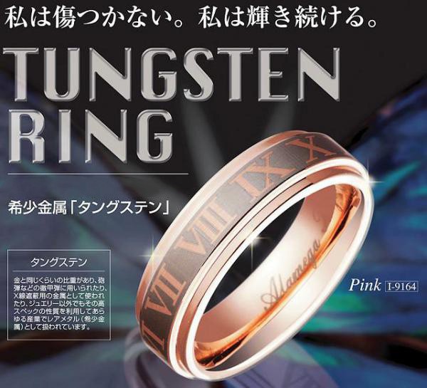 とても硬いタングステンは、ダイヤモンドに匹敵するほどの硬度を誇ります。滅多な事では傷が付かないため、この高級感あふれる輝きは何十年も色あせないと言われるほどです。タングステン独持の重厚な輝きと、どっしりとした肌触りは、他の金属では味わえない高級感があります。その孤高の質感と、スタイリッシュなデザイン、さらにピンクゴールドが、肌にもしっくり馴染み甘くなり過ぎず、お洒落な印象です。男女、年齢、ファッションを問わずお使い頂けるのでペアリングやプレゼントとしてもぴったり!(タングステン:金と同じくらいの比重があり、砲弾などの徹甲弾に用いられたり、X線遮蔽用の金属として使われたり、ジュエリー以外でもその高スペックの性質を利用してあらゆる産業でレアメタル(希少金属)として扱われています。) | |