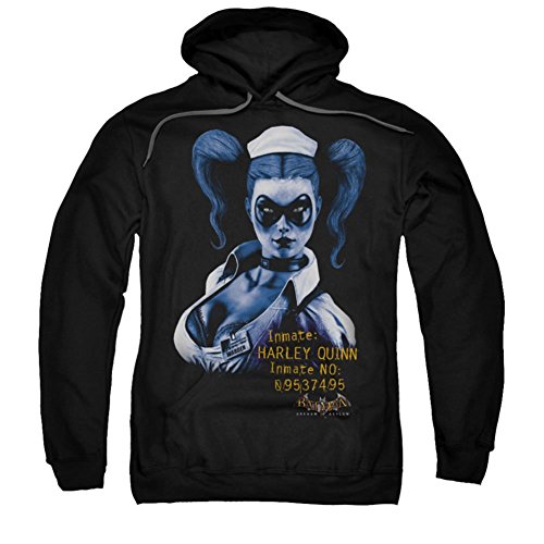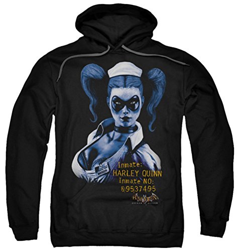 Click here for all body styles available with this graphic. Click here for more Batman Arkham Asylum products. If you are headed out into some cool weather and want to show your love of Batman Arkham Asylum there isn't a better way then this nice warm Arkham Harley Quinn hoodie. More description pending. Features: - Black Hoodie