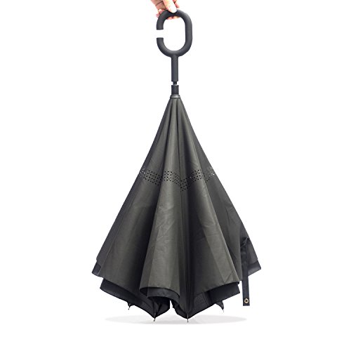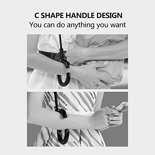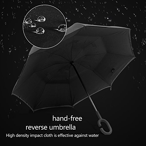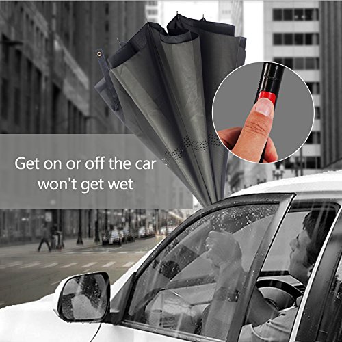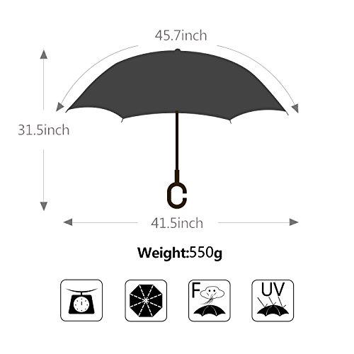 -. Feature : HIGH WINDPROOF AND UV PROTECTION: Double layer inverted strong ribs and double layer high quality pongee cloth canopy with nice vent holes makes high windproof ,waterproof and UV Protection. / REVERSE DESIGN:Inverted design keeps the water inside of the umbrella after folding and protects you not get soaked while getting in or off your car , in and out of your home. / High density 210T water-repellenting pongee canopy No 190T or 180T provides double protection for you from heavy rain and direct sunlight (UV protection); vent holes in the decorative layer is helpful for air exhaust and withstand heavy wind / Self standing on its own easily ,easy to place and drip free. / The C-shaped hand grip help you hand free by hook umbrella with your wrist, you could lift a bag in rain, also for mothers have a baby in arms.
