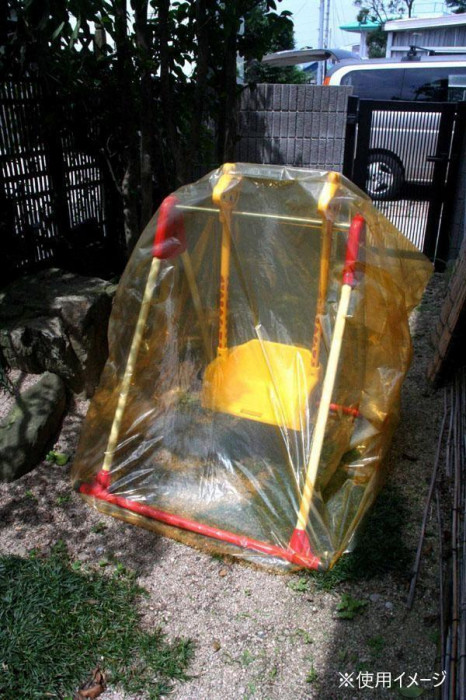 | 紫外線を遮断する袋です。家の外に置いて雨や日光で劣化しやすいプラスチック製品の保存に最適。ほこりなどの汚れも防ぎます。まぐちを広い面(190cm)につけた収納袋ですので、大きな物でも収納できます。 |
