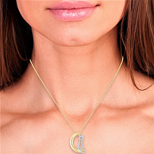 ❤ FEATURES: Little kitten cat on crescent moon necklace 18kt. Gold over 925 Sterling Silver. Accented with sparkling pave set white cubic zircon frames the charm. Quality link chain which has a 2" extension. And, notice the yellow gold on the cats neck.